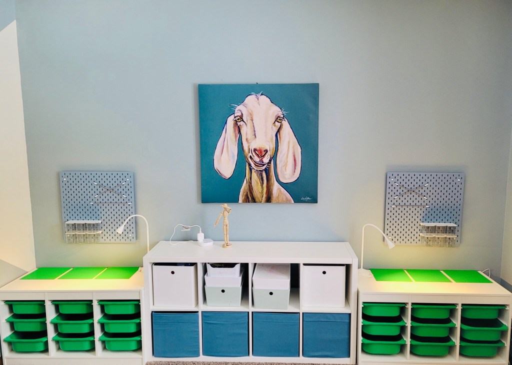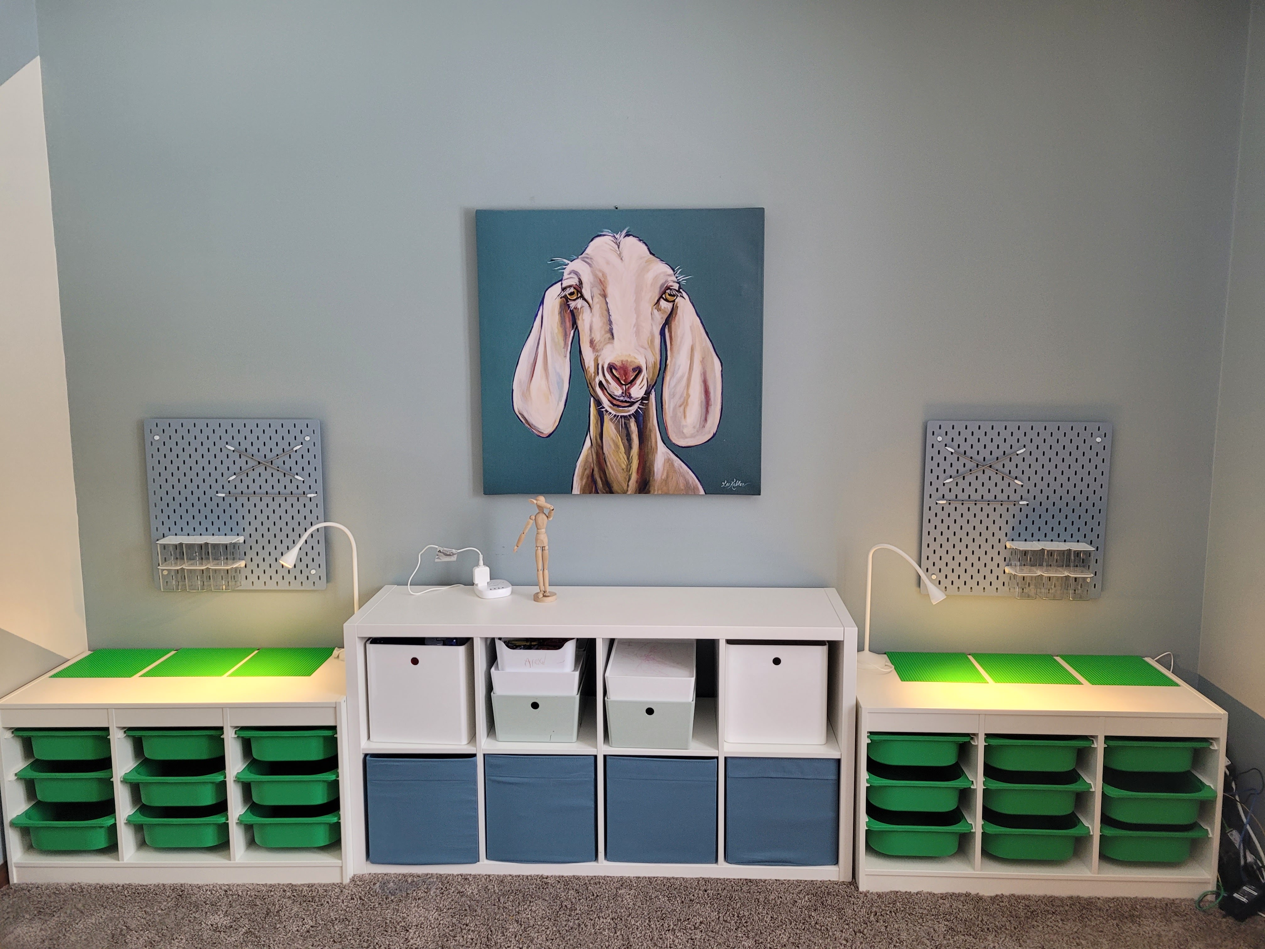The final step was to hang the peg boards, plug in the lights, and set up the Lego base plates. Of course, we had to move our beloved goat painting to the area to give it a fun vibe. Here is the final result!