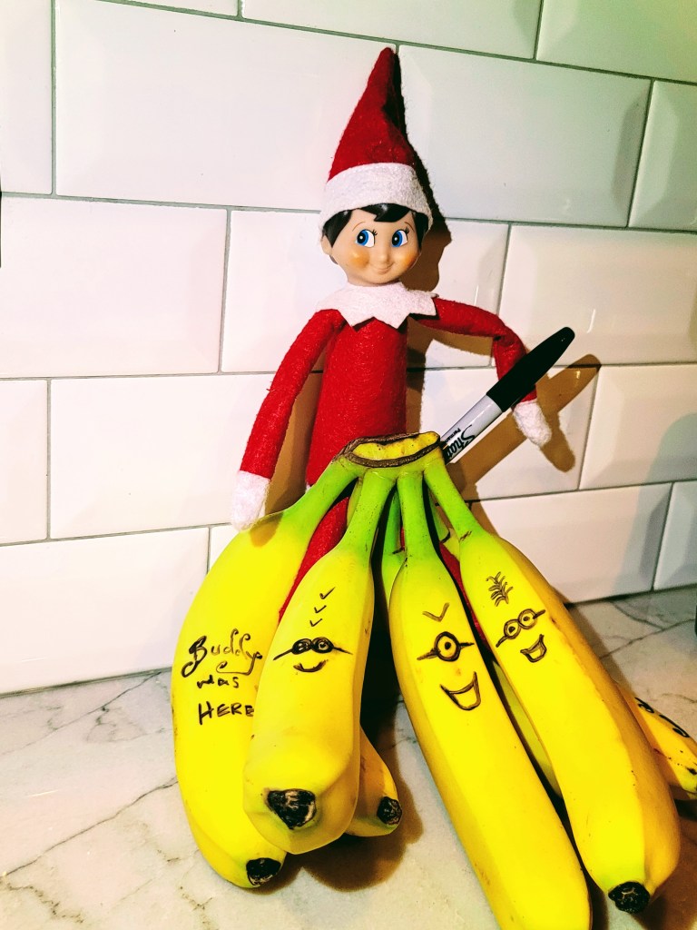 I also wrote a quick note on the last banana (not seen) to make sure the Elf Pets were being taken care of. My kids took his advice and took the pets out to breakfast today! Nevermind that we almost lost Biscuit, our St. Bernard!
