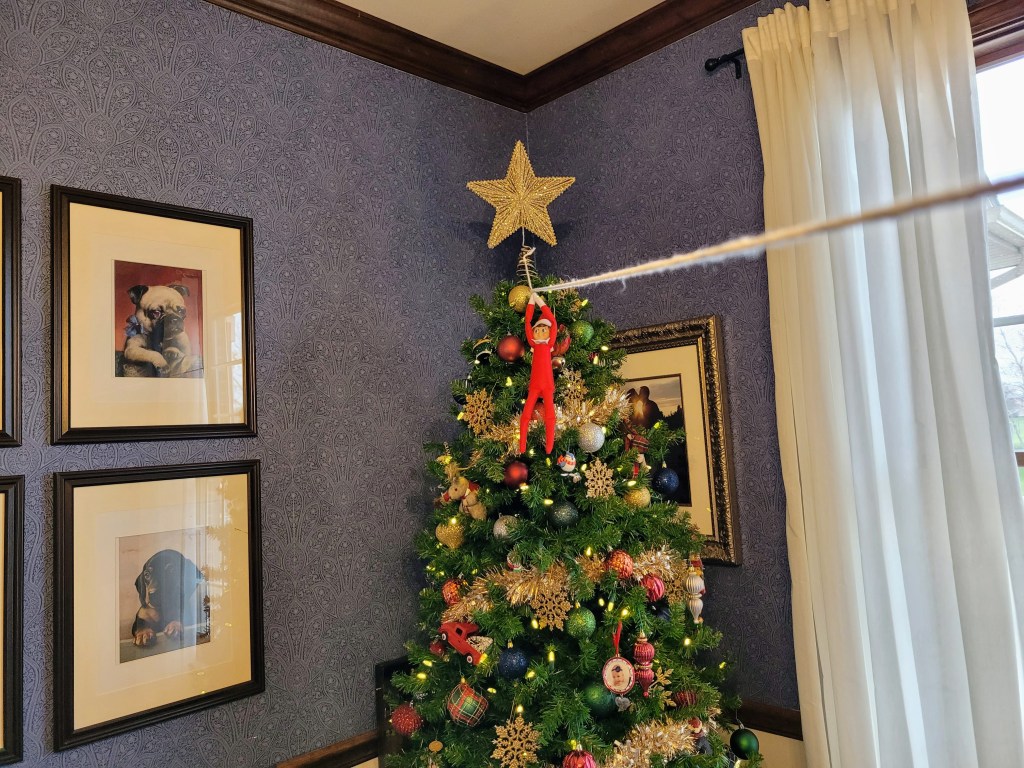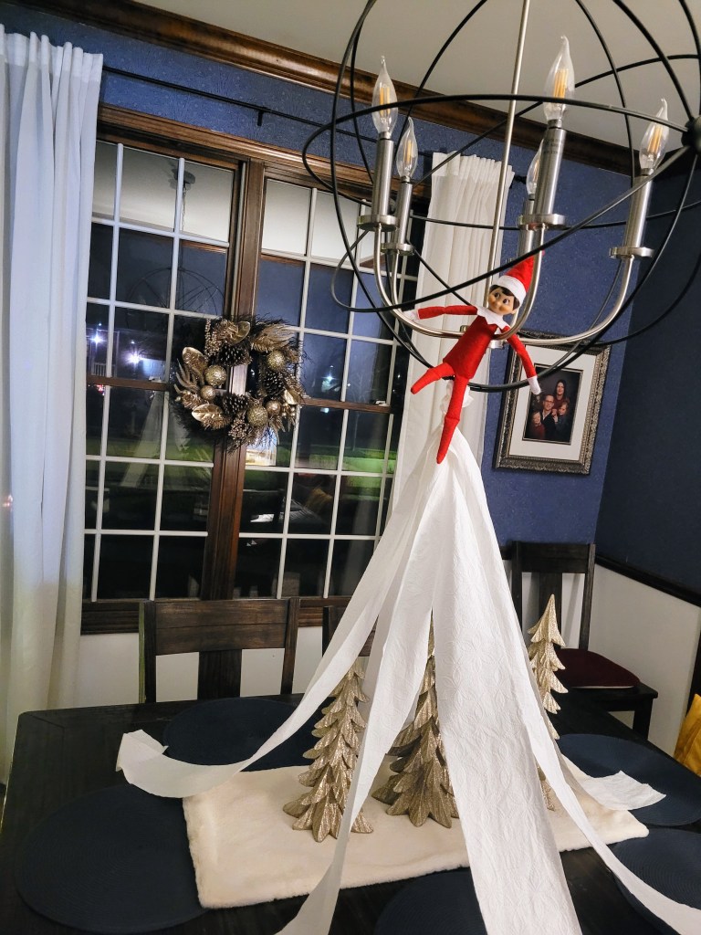 I added a piece of tape to attach all 6 pieces of similar length toilet paper together on one end. Once the toilet paper was secured together at one end, I added a medium sized safety pin to hang it from the light. I propped the Elf on top of it and made sure he wasn’t going to fall during the night. Finally, I splayed out the end of the toilet paper to make the tree shape. My kids were thrilled with the hijinks the Elf pulled and are excited to see what he’ll do tonight.