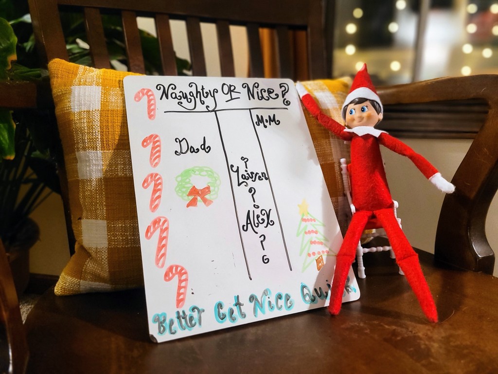 Our Elf wrote up a Naughty or Nice list last night! I made the cut but everyone else is up for consideration. The only items you really need are a small dry erase or chalkboard and markers/chalk. You could even just draw the list up on a piece of paper! I am all about simplicity with the Elf and this one fits the bill.