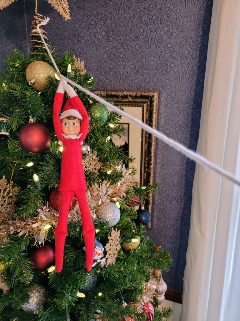 The ziplining Elf is one of my kids’ favorite Elf hijinks! Both of my kids squealed when they saw Buddy hanging from some string in our dining room. Every year, the Elf does this little trick and it never disappoints!