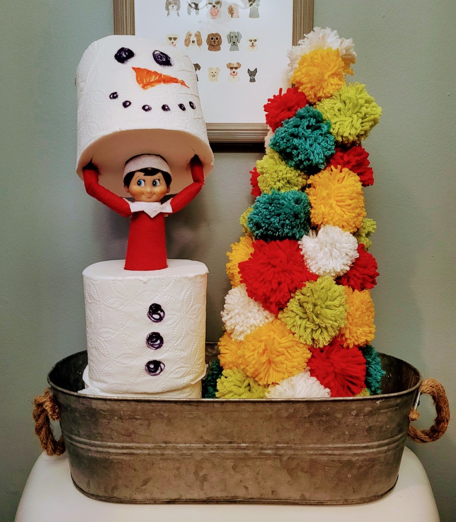 Just some troubleshooting tips – make a spot for the Elf’s hand by putting your finger in the layers of toilet paper and creating a space for it’s hands before you put them in. Also, since you are stacking some rolls you may want to consider putting them into a container so its less likely to fall over. I have it on the back of the toilet so a container was necessary. And there you have it! It only takes about 5 minutes or less to complete and your kids will really enjoy it!