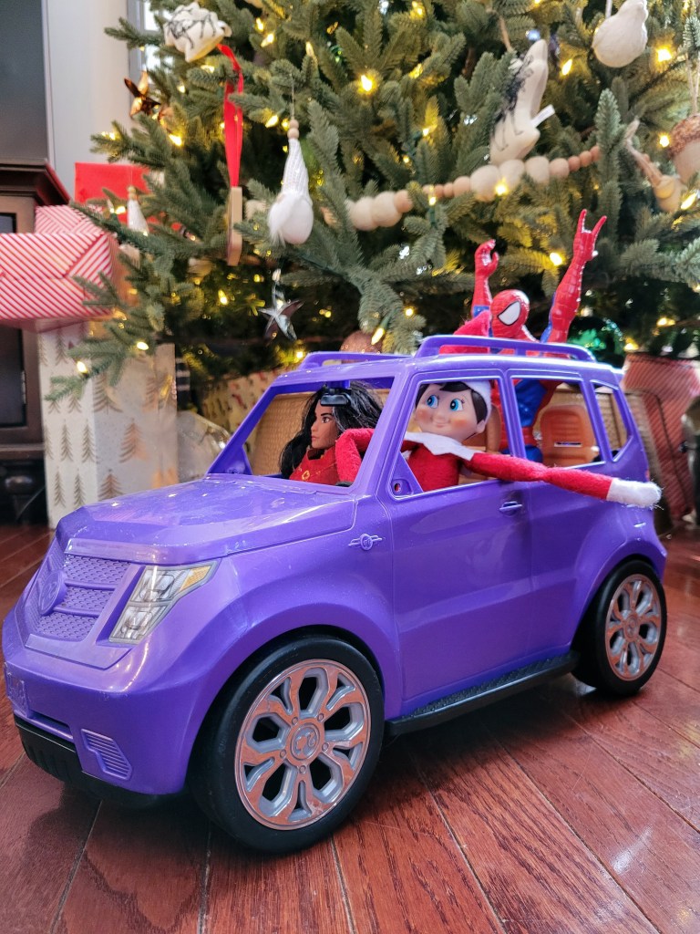 I like this idea because it is very versatile with many options for variations. The variations could be the Elf riding something, the Elf getting ran over by a toy or getting stuck in a toy – the options with your child’s toys are endless. Earlier this month, I also had Elf riding a toy moose! Have fun getting your Elf into some trouble!