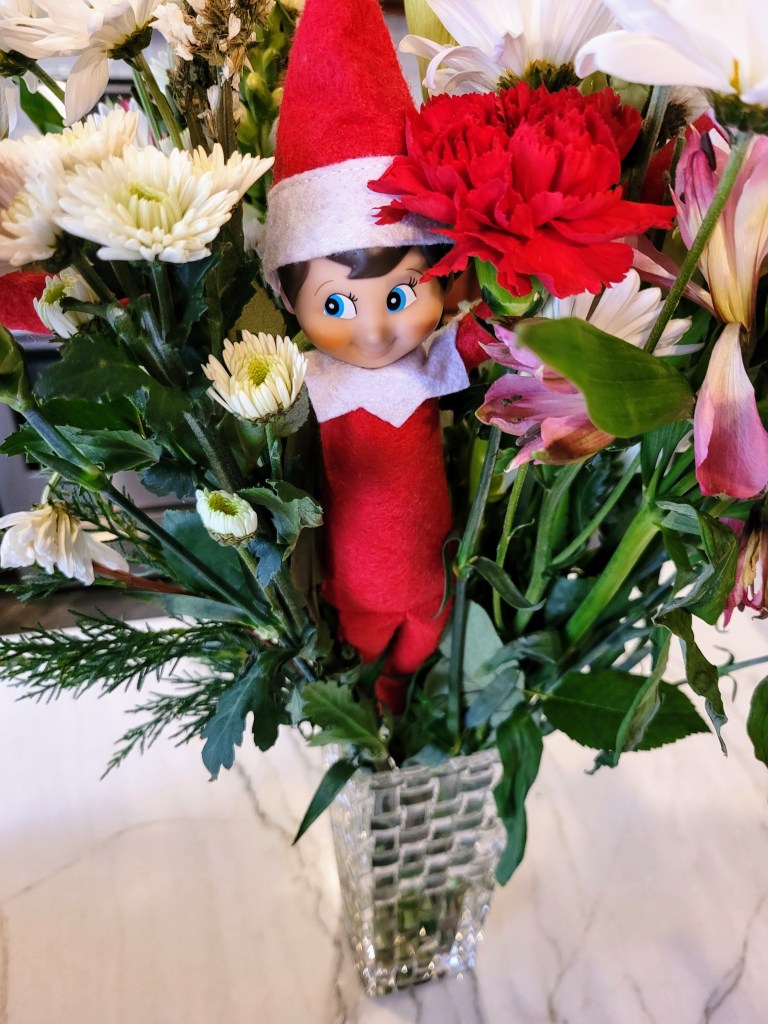I try to do new hiding spots each year but some just make the rotation from year to year because the kids are so entertained by them. The Elf in the fridge with a blanket is classic and will never get old in our house. Two other ideas that I use yearly is Buddy in the tree and Buddy “stuck” in the lantern. My new spots included putting Elf in the hamster ball and putting him in my birthday flowers. Buddy was nicely camouflaged among the flowers so it took awhile for the kids to find him.