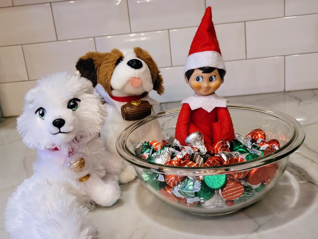 All that’s needed for this idea is a container or bowl and a bag each of Hugs and Kisses. Sit the Elf down in a container or bowl and cover his lap with the chocolates. I am placing his pets around the bowl as a gentle reminder that they will be leaving too! I put together a short note from Buddy bidding his farewell to the family as well. It’s a nice way to say goodbye especially for kids that may be emotionally attached to the Elf and/or it’s pets.