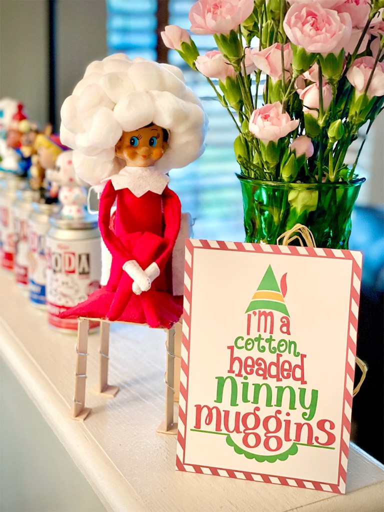 We are big fans of the 2003 movie Elf, and that is where this idea gets its inspiration. Sitting with a big, fluffy hat and a silly sign telling all of us he’s a Cotton-Headed Ninnymuggins, our Elf made us all smile this morning! My girls immediately recognized the reference to their favorite holiday movie, which made it all the more fun! They just couldn’t get over how our Elf made himself a silly cotton hat, and you might be wondering that, too, so I’ll let you in on the secret!