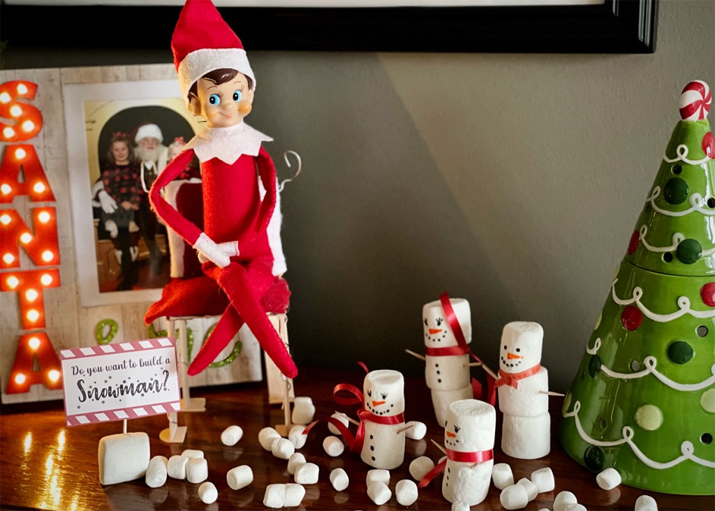 Our printable “Do you want to build a Snowman” sign is just cut out and taped to a toothpick! This display only took about 10 minutes to complete, and was well worth it in the morning when the kiddos were nibbling mini-marshmallows and gushing over our Elf and his adorable snow-family!