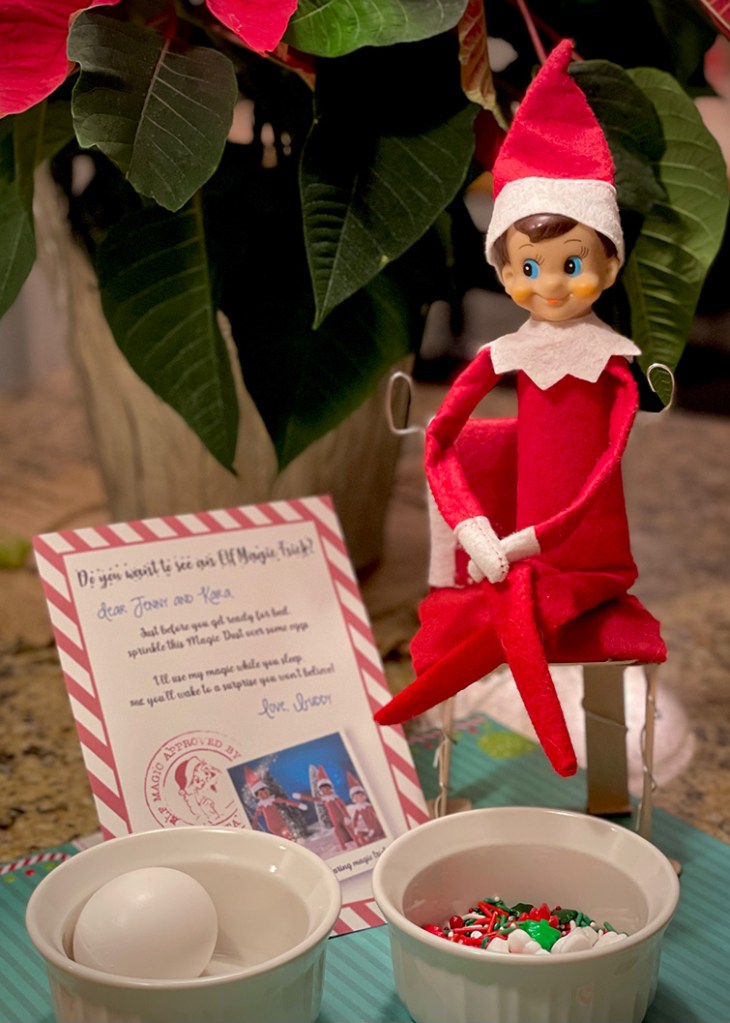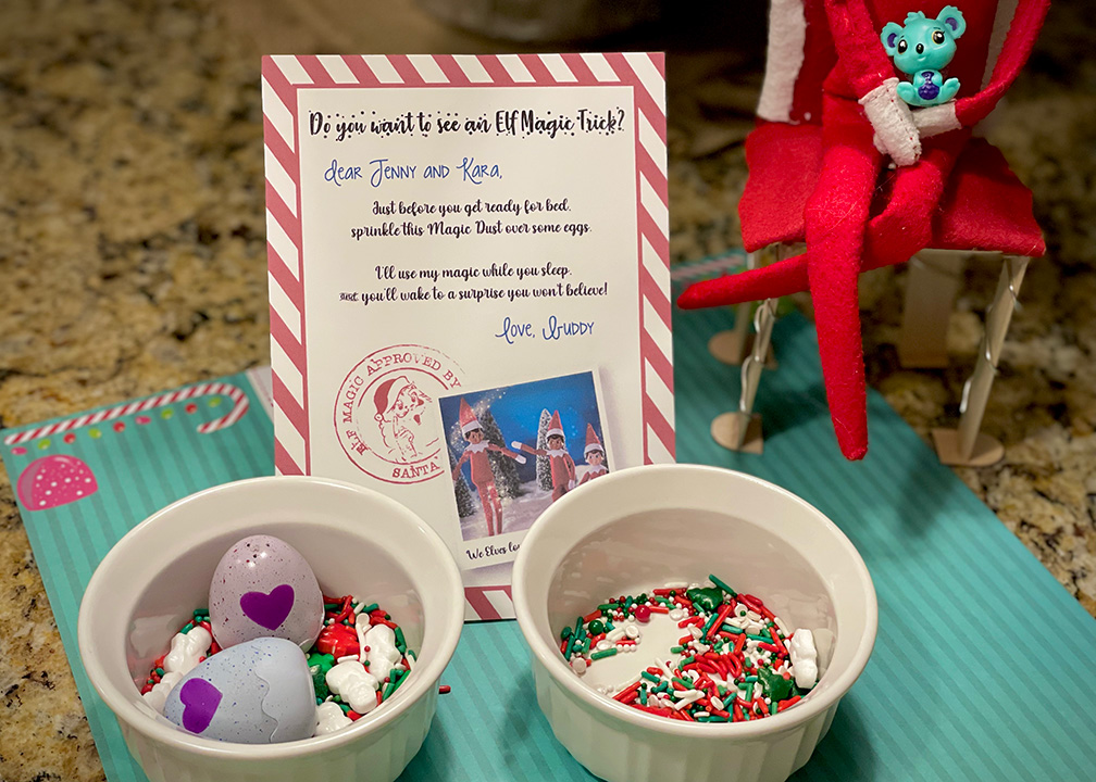 My girls really loved this Elf idea. They were so excited to sprinkle the eggs and couldn’t wait for the next morning to see what “magic” would happen. It’s not often the kids get to actually interact with their Elf, so this really made them feel like they could “play” with him! And, any time we parents can get a night off from thinking up Elf shenanigans, it’s a win! (Just please don’t forget to swap the eggs for a toy surprise on that second night!)