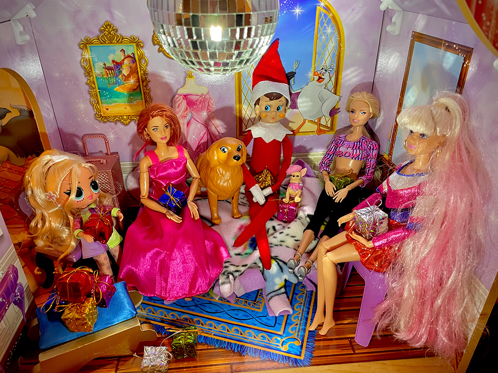 Our Elf is such a social butterfly! He makes so many friends every year when he comes to visit us, and is so sweet to remember to bring all of them a little something from the North Pole. To set the stage for this Elf scene, use the toys and accessories you have on hand around your house. For our setup, I chose some of their favorite Barbie and LOL dolls (and the pups, too!) to use in this Elf gift exchange.