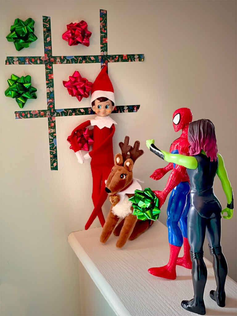 We love everything Marvel in our house, so I chose a couple of the girls’ Marvel action figures to play a round of tic-tac-toe with our Elf and our Elf Pets Reindeer. The girls really got a kick out of the scene, where Spiderman and Guardians of the Galaxy’s Gamora look to have lost the game! There are so many playful ways to present this idea – we hope you have much fun with it as we did!