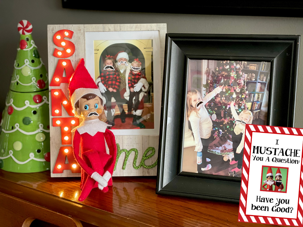 This idea is very simple to pull off. All you do is add little mustache stickers to nearby photos and to your Elf if you’d like him/her to have one (we used these). Our free, printable card asks the question every Elf wants to know less than a week away from Christmas: Are your kiddos being good? However, you could make your own note asking any number of questions to your kiddos: Are they keeping their rooms clean? Are they listening? Finishing their homework? Do they simply like the mustaches the Elf put on their photos? Use what works for your family, and have fun!