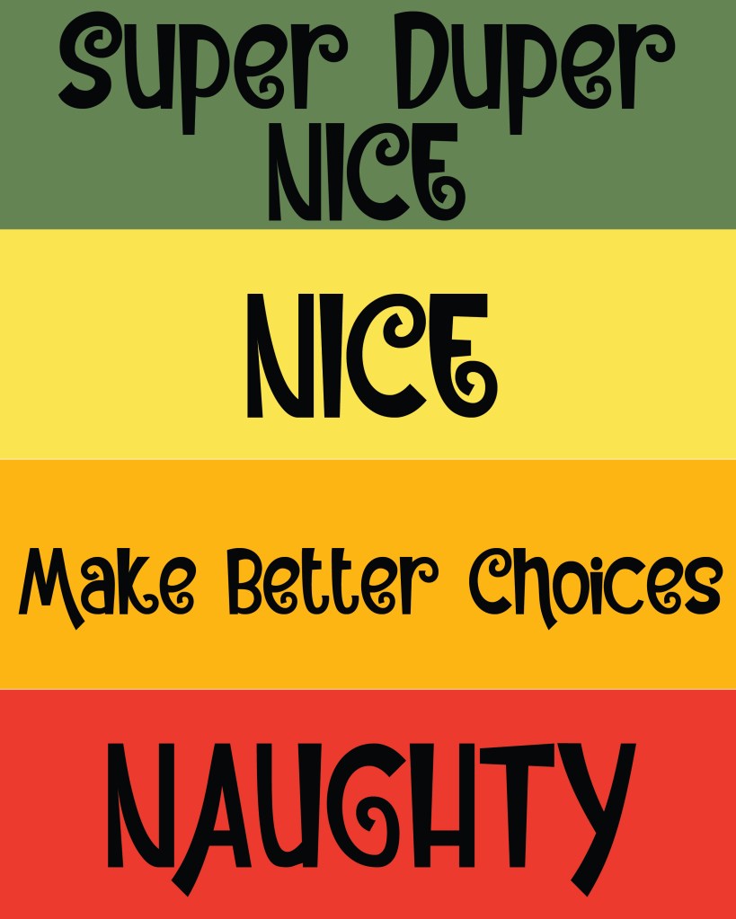 This chart can be used for multiple nights so if you’re feeling the need for a break, use the chart for a couple nights in a row! You could leave a hand-written note on the second night encouraging your kiddo to keep that “Super Duper Nice” ranking! This is a great way to remind your kids to keep that “Christmas Spirit” in mind these last few days before the holiday is here.