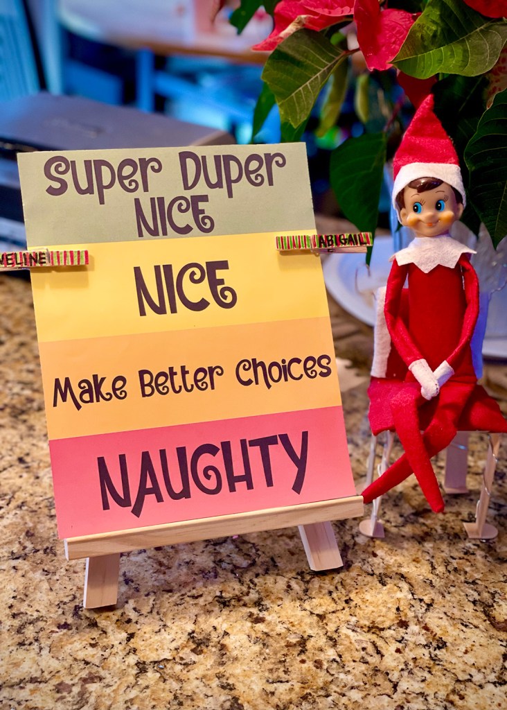 Our Elf sure is encouraging the kids stay on the “Nice” list this year! He brought this Naughty/Nice Clothespin Chart to show the girls exactly where they stand with Santa these last few days before Christmas!