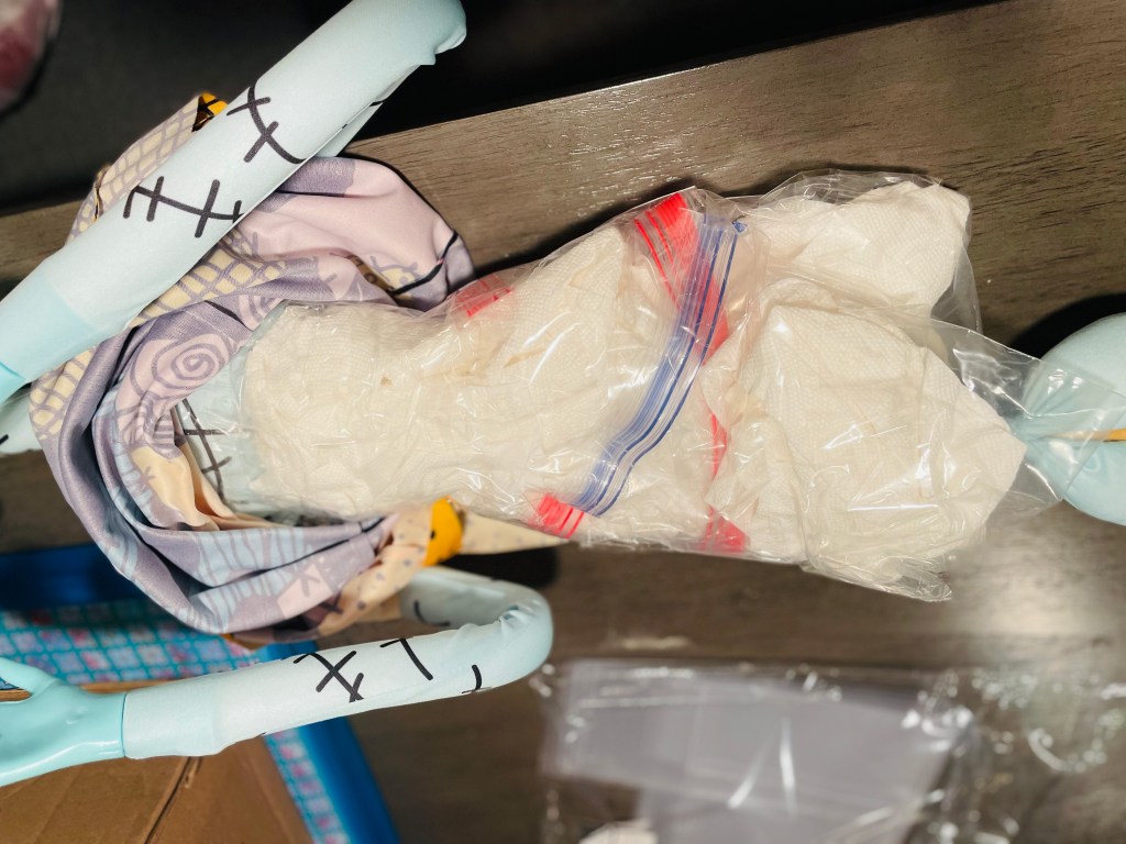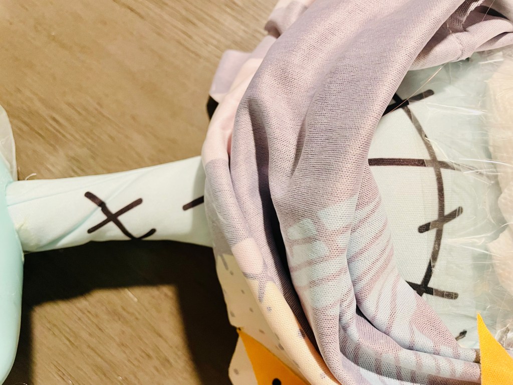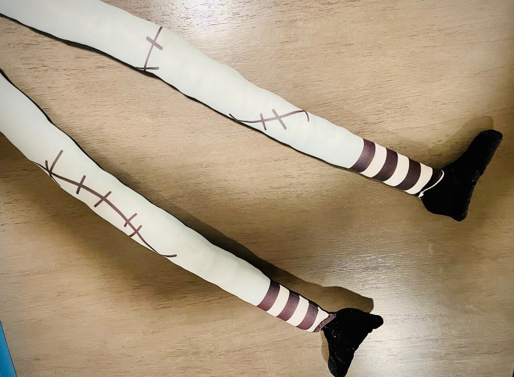 Inspecting a little closer, I realized Sally’s flat legs were actually sewn sleeves that you could stuff! Grabbing some Poly-fil, I stuffed her legs as full as I could get them. I needed to cut holes in the flat legs to do this, which I did high up so that her dress would cover up the cuts. This process took a little while, and I definitely needed to pack the Poly-fil in tightly, but when it was finished, Sally’s legs looked great!