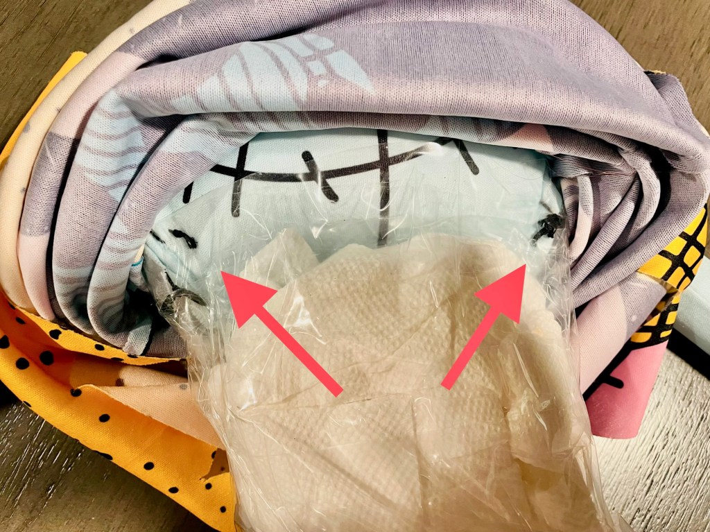 When I was all finished attaching the bags and wooden dowel, I used a little more packing tape to shape the bags into a “feminine” silhouette! You can play around with this and make it to your liking!