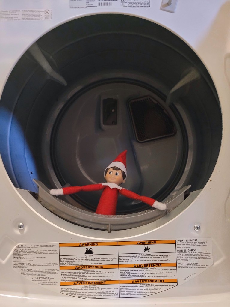 If you are already feeling the fatigue of owning an Elf, I am here for you today! The Elf wanted to find a new place to hide today so he went for the lint trap. It took the kids about 15 minutes of looking around the house to find him here. We have guests over today so we won’t be using the dryer so keep that in mind if you need to use your dryer. Never underestimate the powers of just finding a creative spot to put him/her!