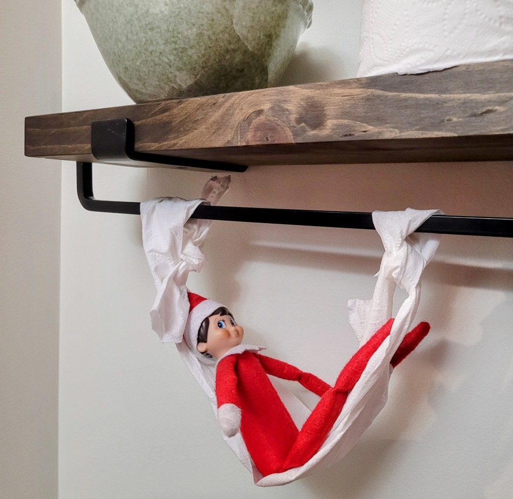 I took about a three foot section of toilet paper, doubled up the paper and tied the ends to a towel rod bar. The main issue I ran into is that the toilet paper is pretty fragile and you have to be pretty careful not to tear the toilet paper as you are tying it to the rod. Just prop up the Elf on the toilet paper as if he is laying in a hammock. I should note that I actually woke up in the middle of the night with anxiety thinking it may tear in the middle of the night and the Elf would end up in the toilet that’s located below the bar! So remember to close the lid to the toilet (if below), just in case.