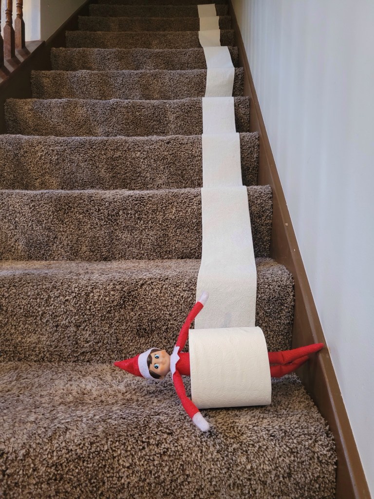 This idea is so fun! All it requires is a toilet paper roll and some steps. I inserted the elf through the toilet paper roll. The butt takes a bit of maneuvering but you can squeeze it in there! I started the “unrolling” about 2/3 of the way up the stairs and put the elf on a few steps up from the bottom. The kids really enjoyed finding the Elf was up to no good!