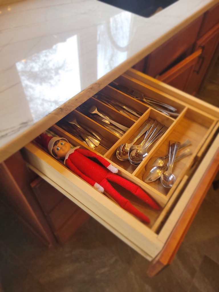 The Elf made a special appearance in the silverware drawer this morning! This one is super easy for those nights that you aren’t feeling up to doing much. My son freaked out because he was grabbing silverware and didn’t see the Elf “Did I touch it?” he said with worry in his eyes. Nope, but he was careful after that!