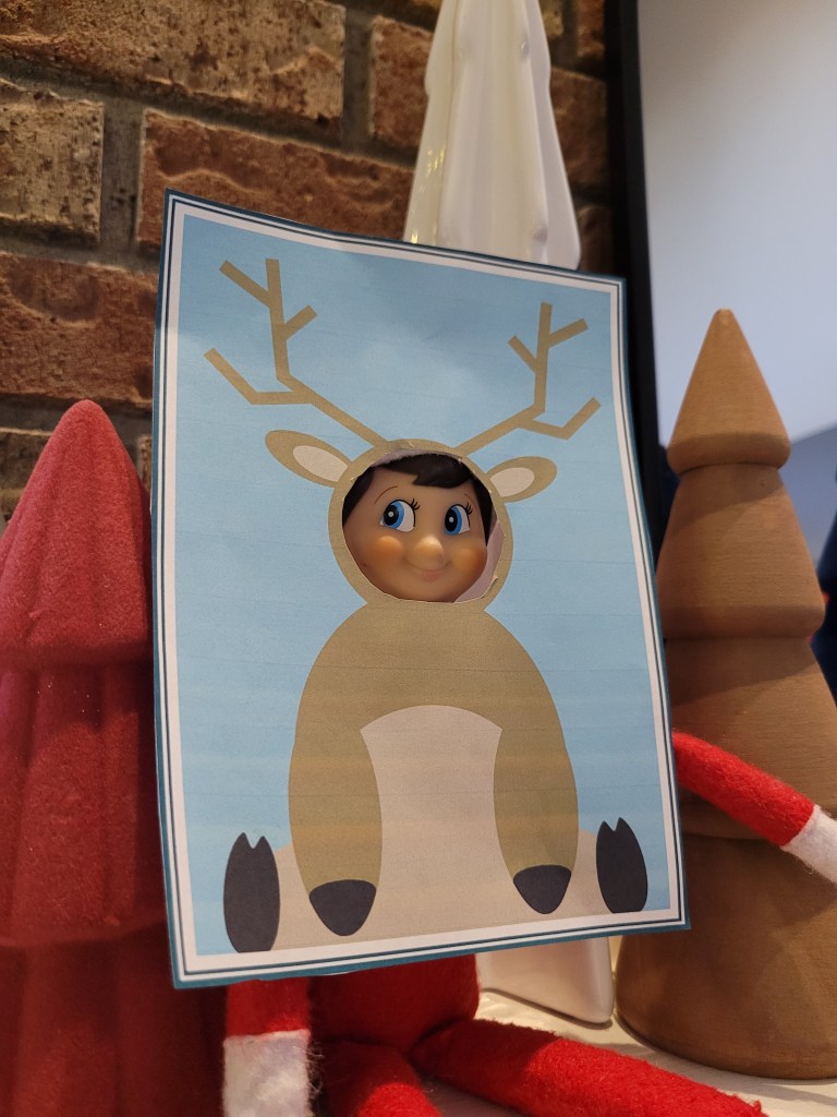 You know those cute displays at events where your kids can stick their face in and then you can get a cute photo of your child with a body of an animal, character, etc? We have one for your elf! Use this printable reindeer so your Elf can become a reindeer over night!
