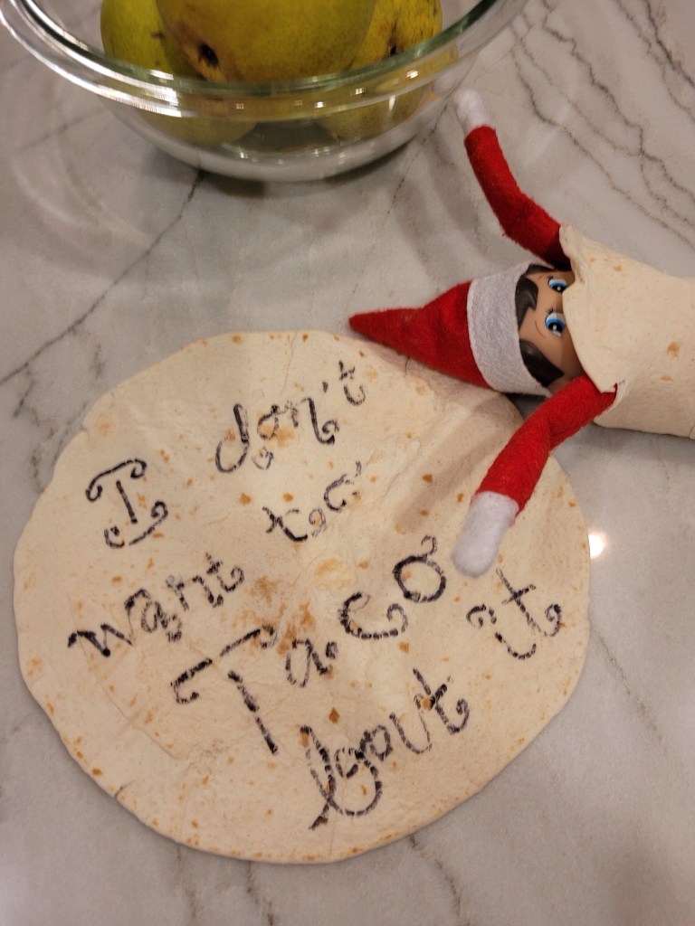 For your Elf to get into this predicament, you’ll just need a couple of burrito or fajita size tortillas and a sharpie. I wrapped one of the tortillas around the Elf and made sure the seam was back side down. I ended up writing “I Don’t Want to Taco bout it“ on the other tortilla. You could also just write the message on a piece of paper instead! My son loved the pun on words!