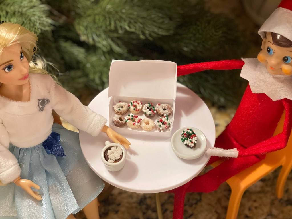 We found our Elf sharing a donut breakfast with our favorite doll this morning! You can recreate this scene with just a few supplies you probably already have on hand: Cheerios cereal (we had original and chocolate flavors on hand), cupcake frosting, and holiday sprinkles.