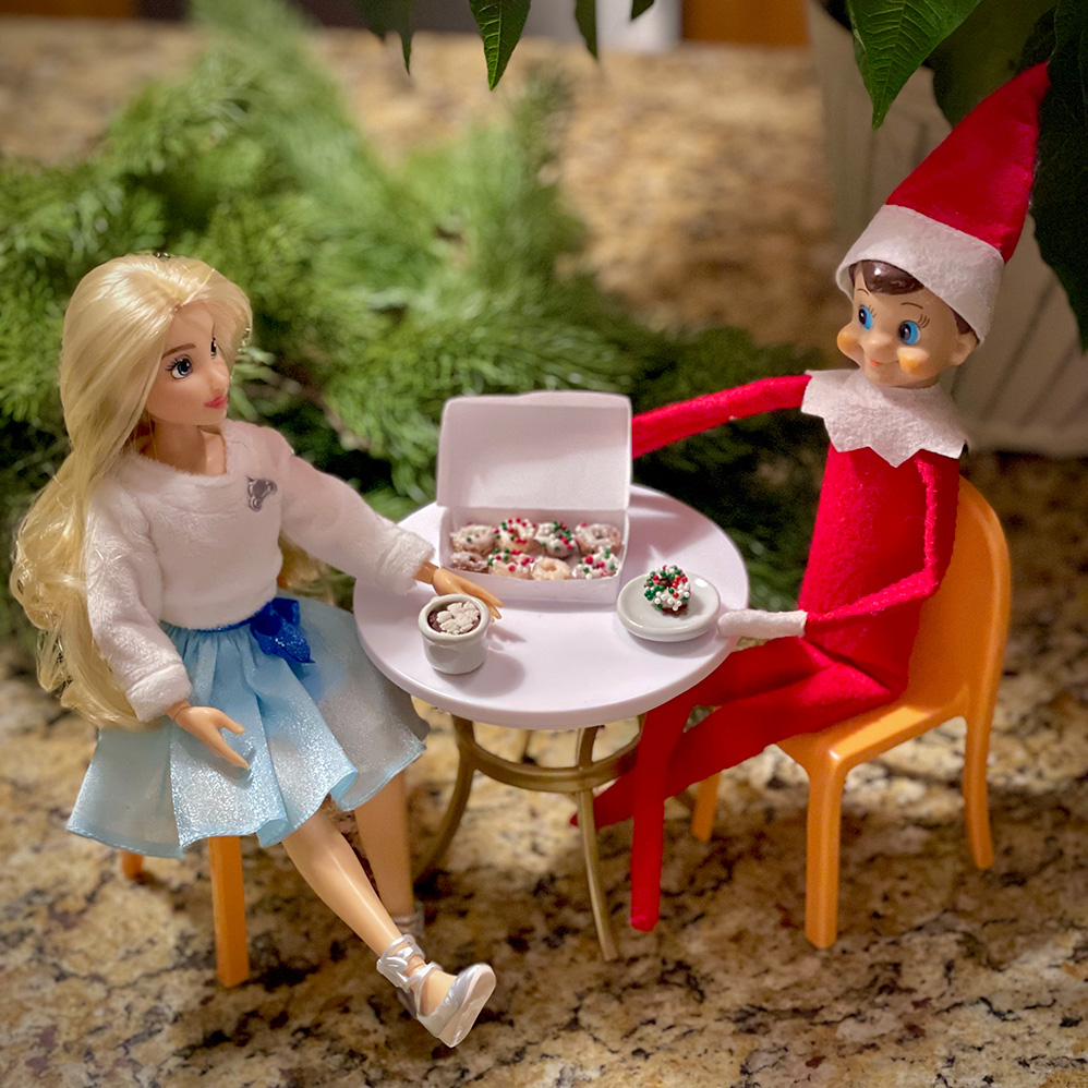 This idea could easily become Elf Cupcakes as well – just use cup-shaped candies like Rolo caramels or Reese’s Peanut Butter Cups for the base, and then frost and sprinkle! My girls really liked seeing our Elf having breakfast with one of their favorite dolls this morning. Hope you have fun recreating the scene!
