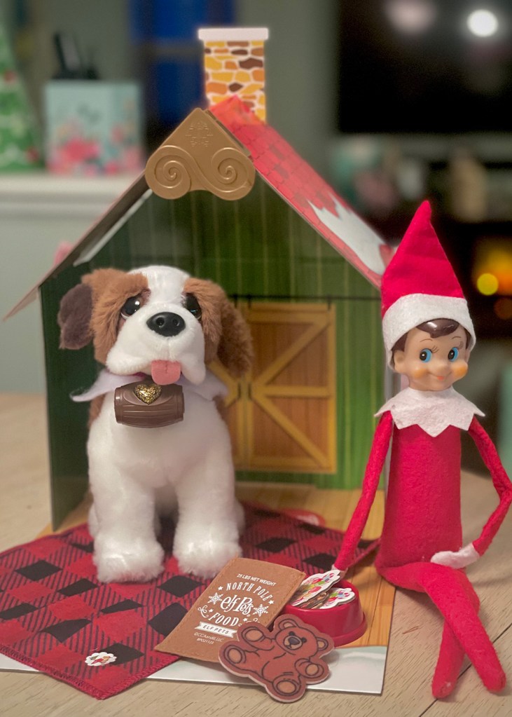 Our Elf just brought the St. Bernard Puppy to our house this morning, complete with his own little dog house, blanket, food bowl and teddy toy. The kids loved the cuddly, soft Elf Pet Pup, and couldn’t resist the adorable playset to go with it. Since it’s a little late in the month for a new Elf Pet to arrive (shipping took forever!), our Elf left a note explaining to the kids that it took a long time for the Pups to arrive because they had been in training with Santa learning how to use their magical barrel collars. This explanation seemed to satisfy the kiddos without question!