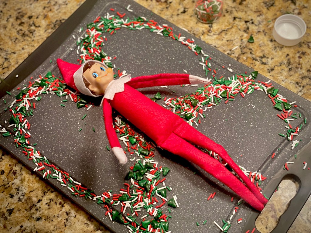This Elf sprinkle angel idea got lots of giggles from the kids because they love when our Elf gets into mischief! To keep the sprinkle mess to a minimum, I set up this display on a cutting board. To get started, shake some sprinkles around the edges of where the “angel” outline will be (it does not need to be a lot!). Then, while holding your Elf firmly in place, move