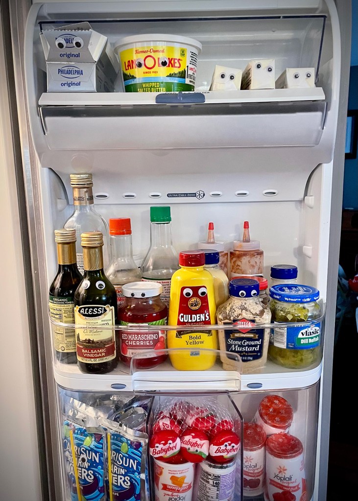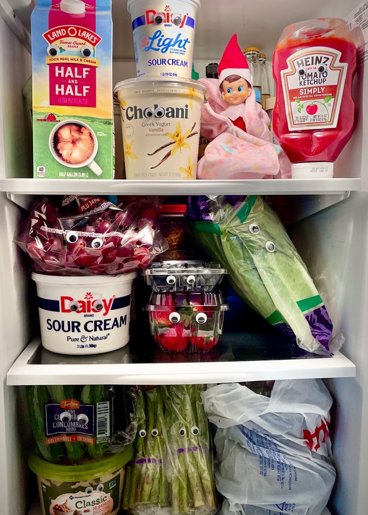 We decided to add to the fun by making it look like our Elf wasn’t just hiding, he was making friends with a bunch of googly-eyed foods! Adhesive googly eyes make this set up super easy, and you’ll be smiling every time you open your fridge for days!