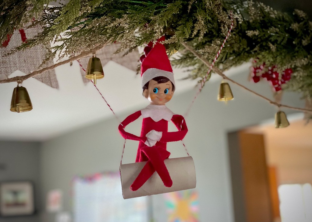 I found it was easier to secure the swing before adding our Elf, and wrapping his arms around the strings helped to keep him upright on the “swing”. To help stabilize him in place further, I used a bit of sticky tack on the toilet paper roll under the Elf’s legs and in between his hands to hold them together (you could also use tape!). Overall, it was a pretty quick set up, and the girls got a big kick out our Elf just hanging around on our holiday decorations!