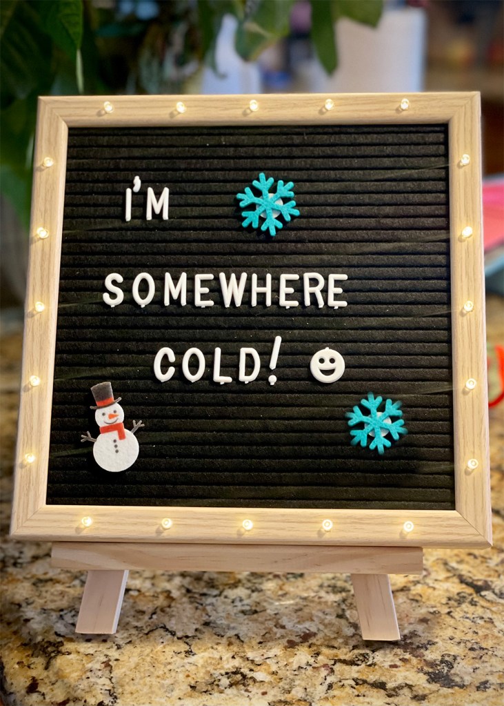This idea is so simple, and was a big hit! Because our Elf was not out in the open, the kids first had to find him. An “I’m somewhere cold” clue out on a letter board made it easier for the kids to know where to look – and they found him wrapped in a blanket inside the fridge!