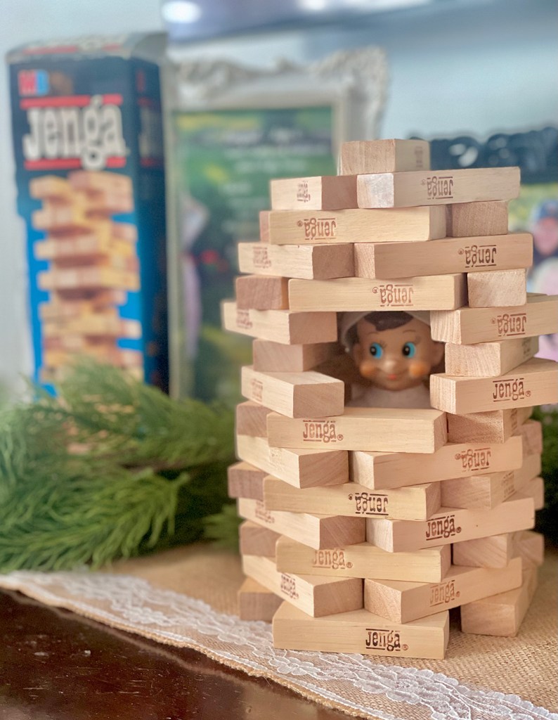 This idea may be my new favorite for our Elf! The kids woke up to find our Elf hiding inside his own little Jenga Igloo, and loved how funny he looked peeking out of a “window” at them!