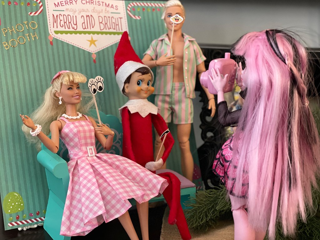 hands of our Elf and dolls, and I even used some on the pink doll’s feet to make her stand. The background of the Photo Booth is just a page of 12″ x 12″ scrapbook paper, and I added glitter letter stickers to spell out “Photo Booth” for an added touch. If you had a polaroid camera, you could make this a 2-day setup and have your Elf give an actual photo the following night!