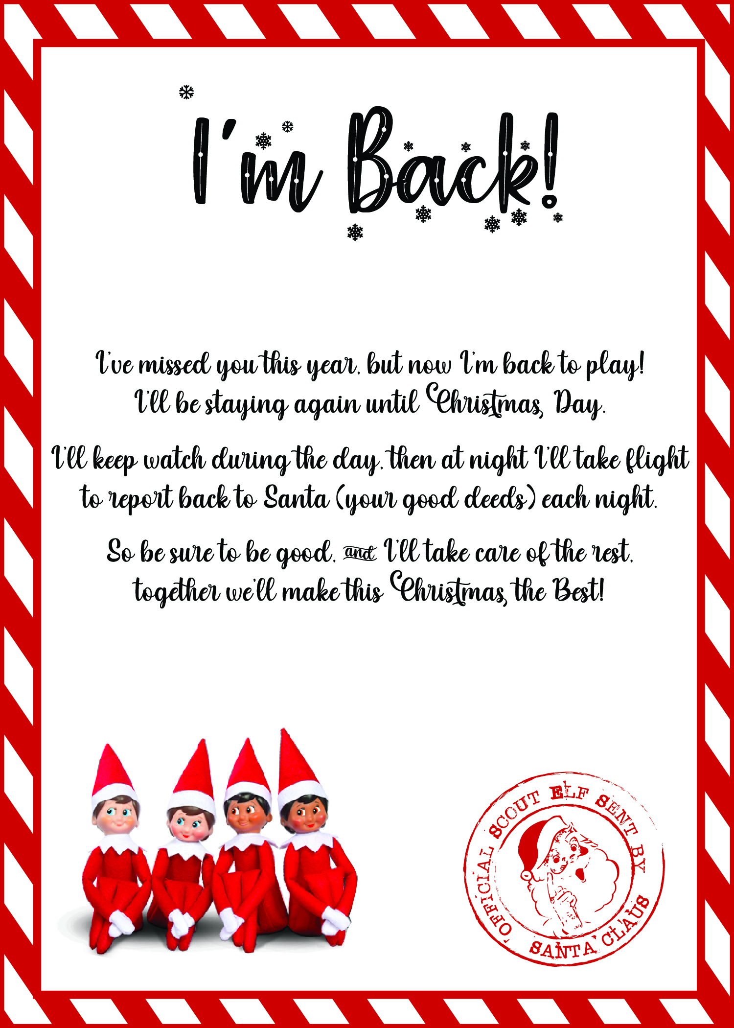 Then, print out this 5×7 card as a fun, Santa-approved greeting from your Scout Elf that tells how excited he or she is to return to your family’s holiday celebrations this year. Use the blank space on top to write your child’s name and then sign below with your Elf’s name to personalize your card to your family. Since our printable card is just a greeting, it can be used with or without an Advent calendar!